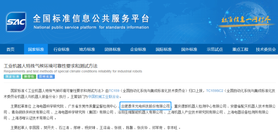 近日,經過網上公示、起草、征求意見、審查、批準,由合肥泰禾光電科技股份有限公司作為主要起草單位(排名前三)起草的國家標準《工業機器人特殊氣候環境可靠性要求和測試方法》(標準號:GB/T 39006-2020)于2020年9月29日正式發布,將于2021年4月1日實施。